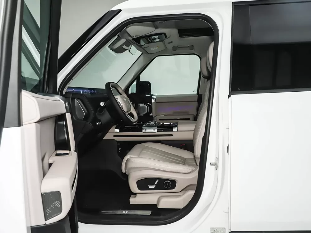 The Zongheng G700 "Dinghuo Mingdi" Edition retains the classic "square-box" silhouette, boasting body dimensions of 5198 × 2050 × 1956 mm and a wheelbase of 2870 mm. Drawing inspiration from the icy cliffs of the Himalayas' North Face, the design features "Steep Cliff D-Pillar Surfaces," infusing a sense of natural rhythm into its rugged contours. The front fascia features a "Glacier Forest" dot-matrix grille, paired with an illuminated brand emblem and "Ice Prism"-shaped daytime running lights, creating a highly distinctive visual signature. The vehicle's profile is equipped with an externally mounted full-size spare tire, power-retractable side steps, and a roof rack, enhancing both functionality and its adventurous spirit. The rear features a horizontally integrated, programmable taillight array capable of displaying custom text and dynamic animations, creating a sense of ceremonial grandeur when illuminated at night. Exclusive custom graphics, hood vents, and 20-inch off-road wheels further underscore its status as a unique, non-mass-production "hardcore" vehicle.