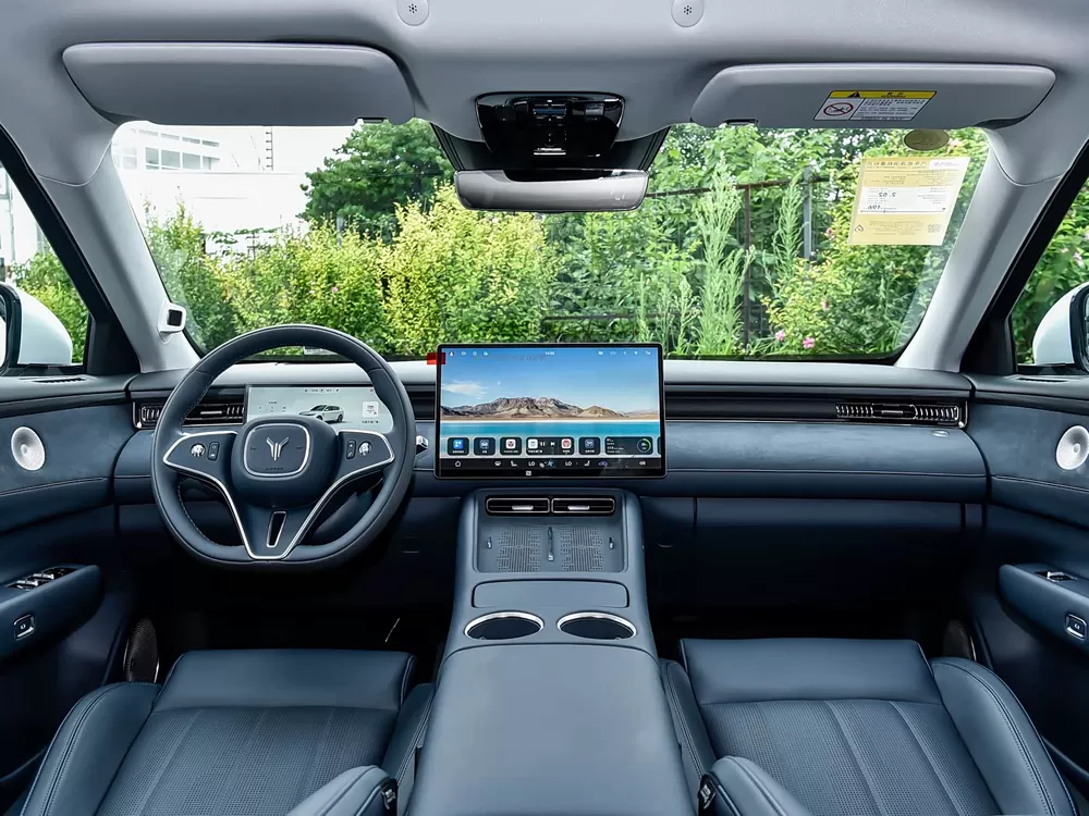 Building upon the rear-wheel-drive (RWD) version, this model upgrades to a dual-motor all-wheel-drive (AWD) system. It features a 135 kW front motor and a 215 kW rear motor, delivering a combined system output of 350 kW (476 hp) and a peak torque of 570 N·m, enabling a 0–100 km/h acceleration time of 4.9 seconds. It is simultaneously equipped with the EDC "Magic Carpet" suspension and a 100 mm adjustable air suspension system, enabling active damping control and adaptive ride height adjustment to significantly enhance off-road capability on complex terrain and stability at high speeds. The intelligent driving system and cabin configurations remain identical to the RWD version, with the addition of a new "Lanqing" Sport Mode; this mode allows for one-touch activation of heightened throttle response and simulated engine sounds, thereby amplifying driving pleasure. An exclusive "Aurora Purple" interior color scheme is also available to further accentuate the cabin's high-tech ambiance, catering to users who value a balanced blend of performance and comfort.